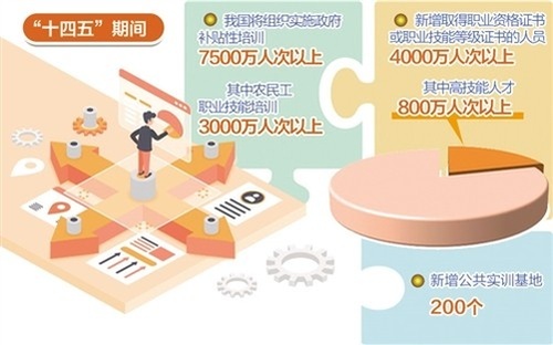 為提升勞動者就業(yè)創(chuàng)業(yè)能力,滿足產(chǎn)業(yè)轉(zhuǎn)型升級和技術(shù)進步的要求,“十四五”期間,我國將組織實施政府補貼性培訓(xùn)達7500萬人次以上,其中農(nóng)民工職業(yè)技能培訓(xùn)3000萬人次以上;新增取得職業(yè)資格證書或職業(yè)技能等級證書的人員達到4000萬人次以上,其中能夠達到高級技工、技師、高級技師的高技能人才達到800萬人次以上;新增公共實訓(xùn)基地200個。
