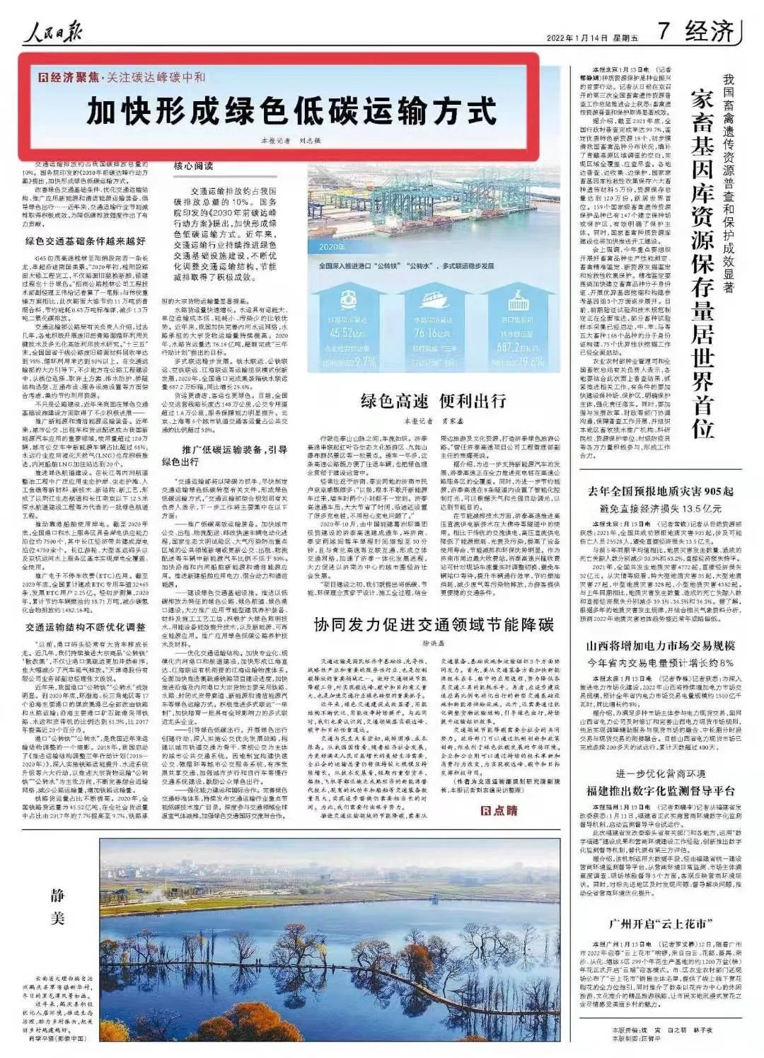 近年來,交通運輸行業(yè)持續(xù)推進綠色交通基礎設施建設,不斷優(yōu)化調(diào)整交通運輸結(jié)構(gòu),節(jié)能減排取得了積極成效。1月14日,人民日報刊發(fā)“關注碳達峰碳中和”專題報道:《加快形成綠色低碳運輸方式》,全文如下↓↓↓