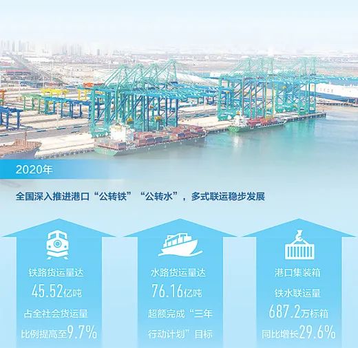 近年來,我國港口“公轉(zhuǎn)鐵”“公轉(zhuǎn)水”成效明顯。到2020年底,環(huán)渤海、長三角地區(qū)等17個沿海主要港口的煤炭集港已全部改由鐵路和水路運輸;沿海主要港口礦石疏港采用鐵路、水運和皮帶機的比例達到61.3%,比2017年提高近20個百分點。
